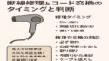 トラブル時の一次対応:コードの根元の折れ、プラグの過熱、フィルター詰まりは要注意。兆候と対処はドライヤーの寿命と異音時の対応と、コードやコンセントが熱いときの対処に詳しくまとめています。正確な情報は公式サイトをご確認ください。最終的な判断は専門家にご相談ください。