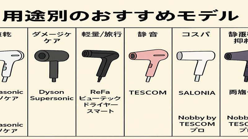 たとえば、静音性を重視するならテスコムのTID3500などの静音設計モデルが有利であり、操作の手軽さや軽量性を求めるならサロニアが快適です。