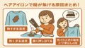安全面では、消し忘れ対策と保管もよく聞かれます。これは内部記事ヘアアイロンの消し忘れ対策にまとめてありますが、オートオフはあくまで保険。使用後は電源オフ→耐熱ポーチ→完全冷却で、周囲の可燃物を避ける、の順を徹底すると安心です。