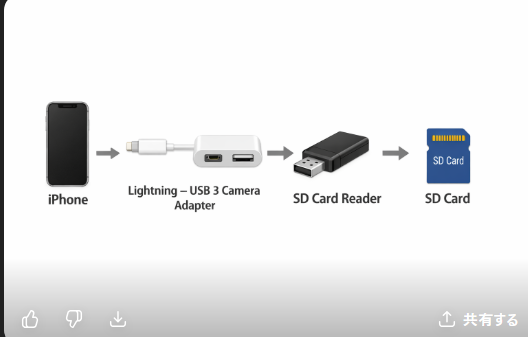 - カードリーダーにSDカードを挿して、iPhoneに接続する