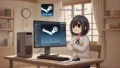 日本のデスク環境で、PS5にSteamをインストールしようとして困惑する人物。モニターにはインストールエラーのような画面が表示され、隣にはSteam対応のゲーミングPCがある。PS5にSteamを直接入れられない技術的な壁を示した場面。