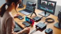 日本人が無印風のミニマルなポーチにNintendo Switch2用アクセサリーを整理収納している様子。ケーブルやmicroSDカード、イヤホンが仕切りごとに整然と収納されており、実用性と美しさを兼ね備えた空間が表現されている。